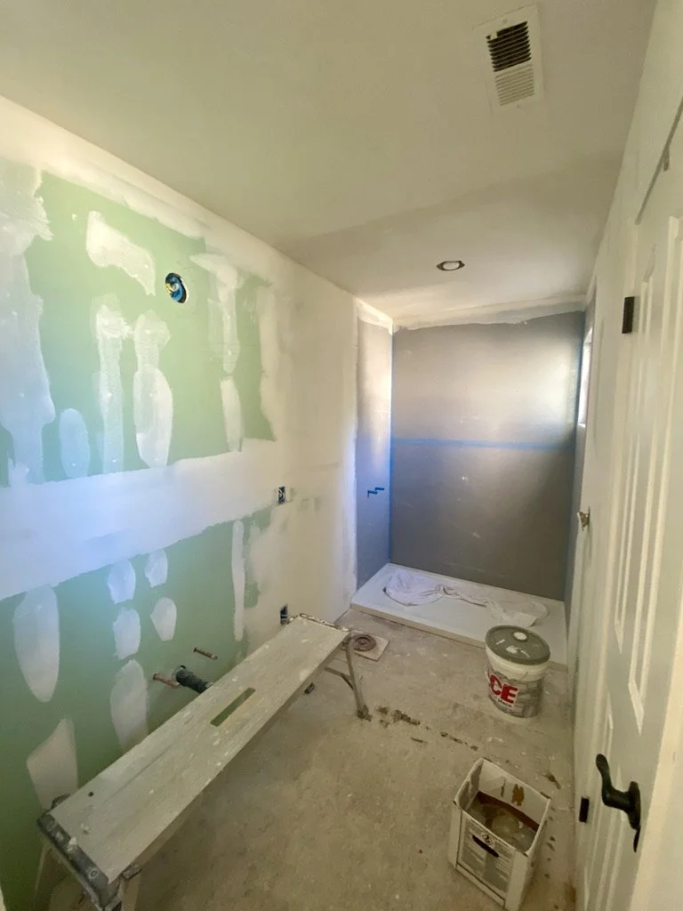 The custom shower was the highest intesity aspect of the project. We used low expansion foam to set and adhere the shower pan into the space, and used fiber reinforced cement board as a high quality substrate for our tile installation. On top of this we used the high performance Schluter system decoupling membrane under the high grade porcelain tile.